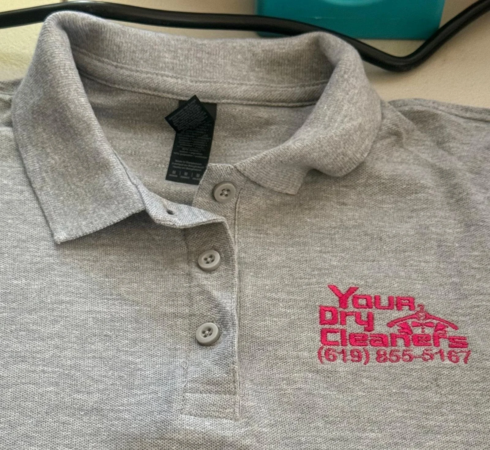 A functional and eye-catching design for a dry cleaning business, embroidered in bright fuchsia thread over a gray polo. This logo includes the business name and contact number, making it perfect for promoting the brand in a professional and practical way throughout the workday.